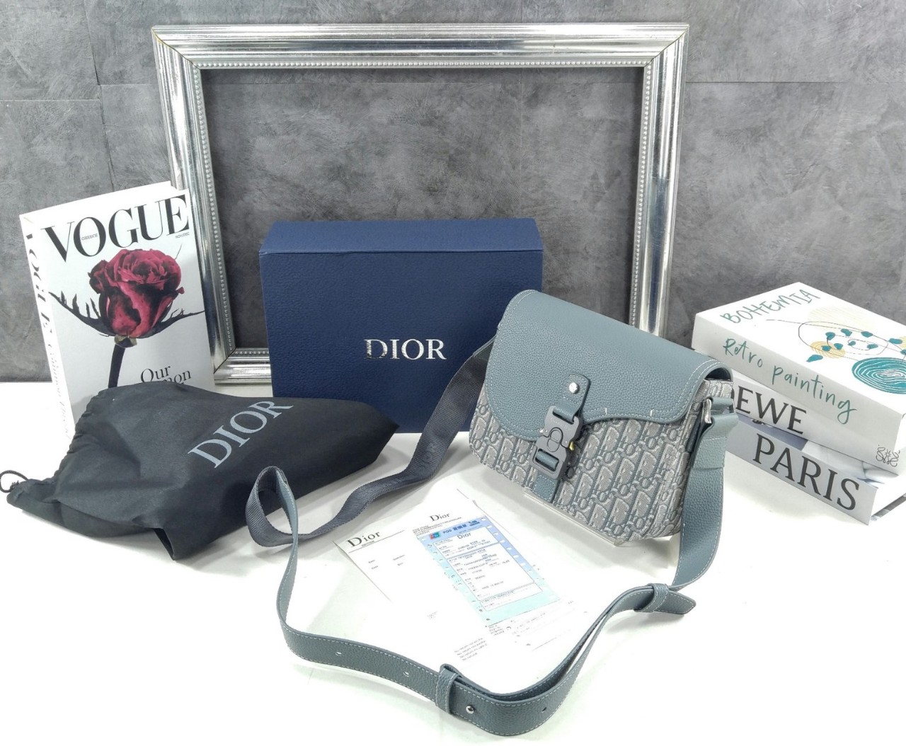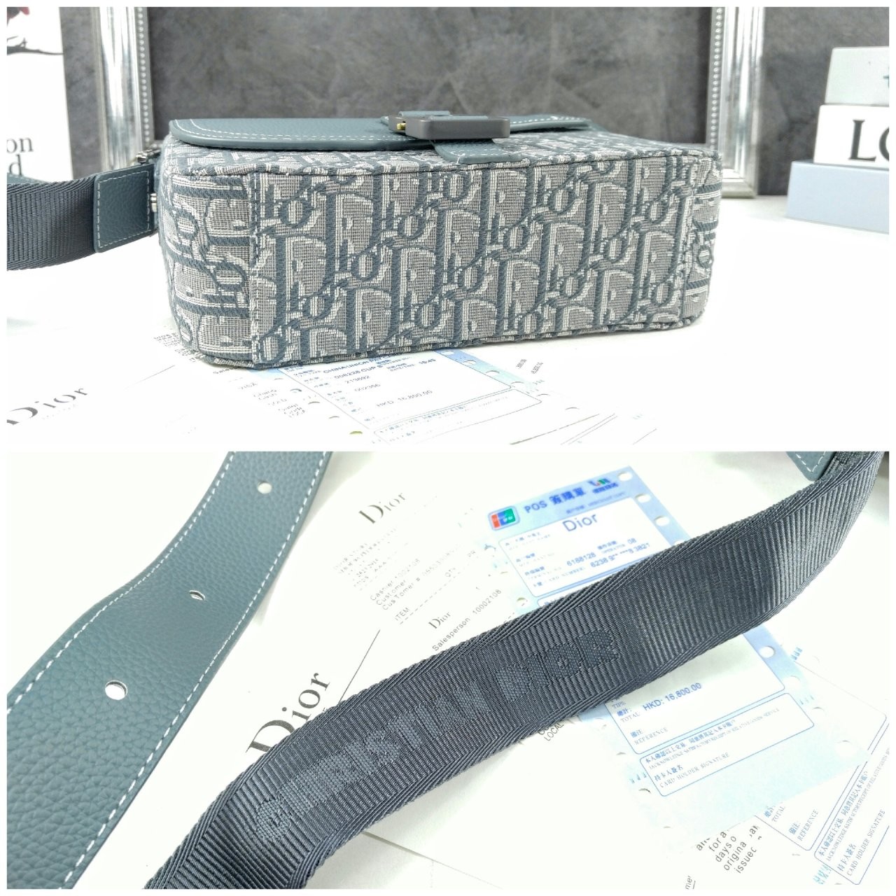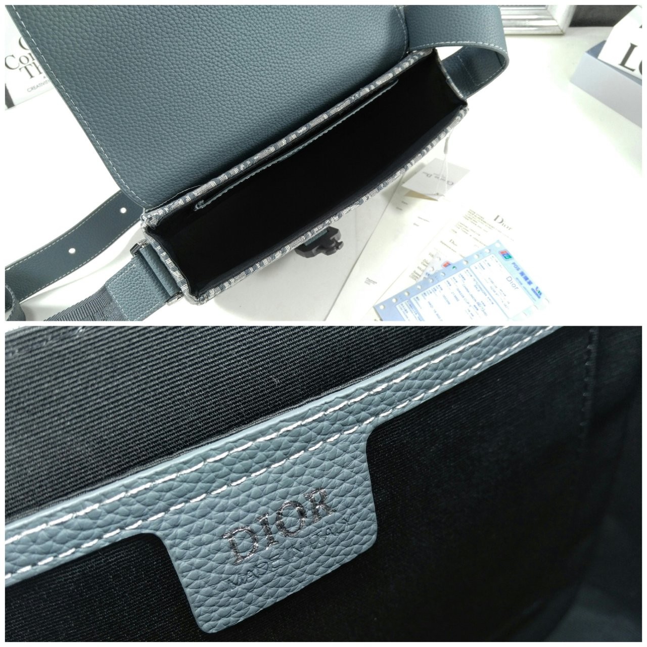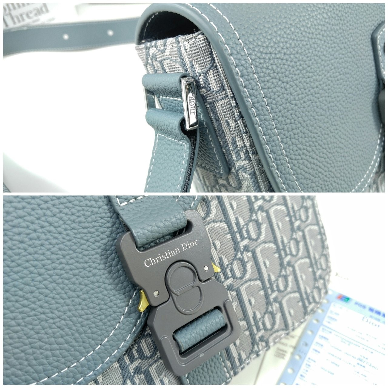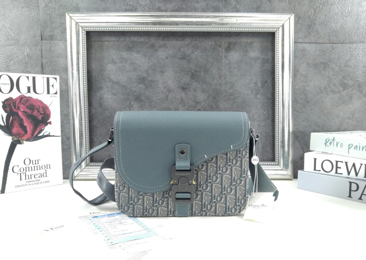 주요 소재: 테크니컬 패브릭, 코튼, 송아지 가죽 테크니컬 패브릭, 코튼, 송아지 가죽 안감 CD 알루미늄 버클 디테일의 메인 플랩 수납공간 내부 슬립 포켓 뒷면 슬립 포켓 길이 조절 가능한 가죽 및 Christian Di○r 나일론 자카드 숄더 스트랩 내부 Di○r 시그니처 엠보싱