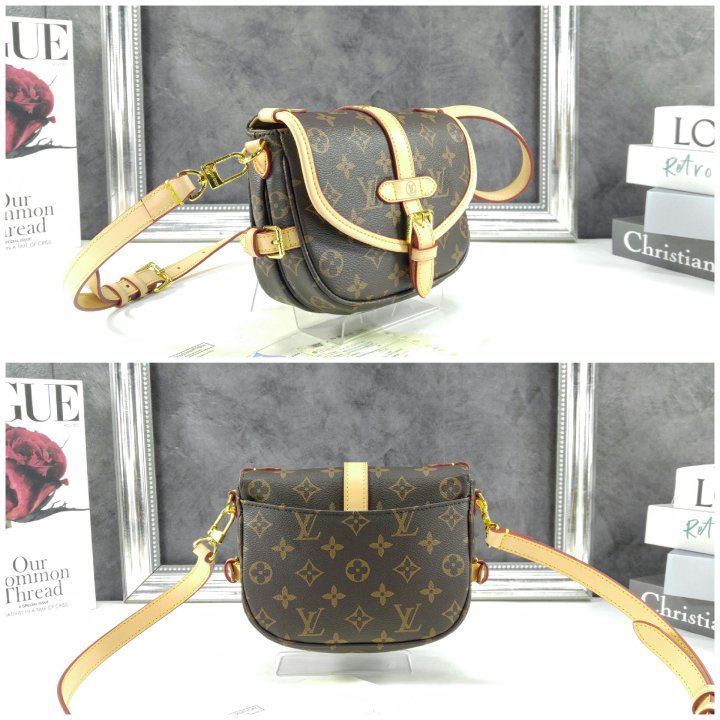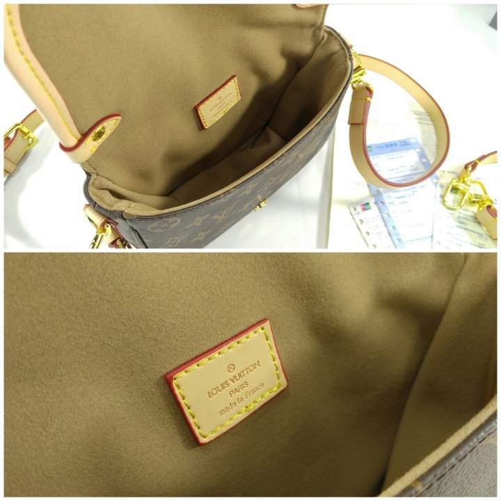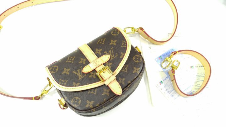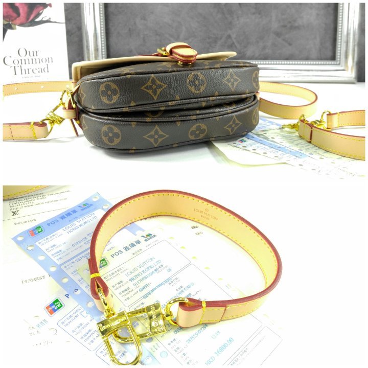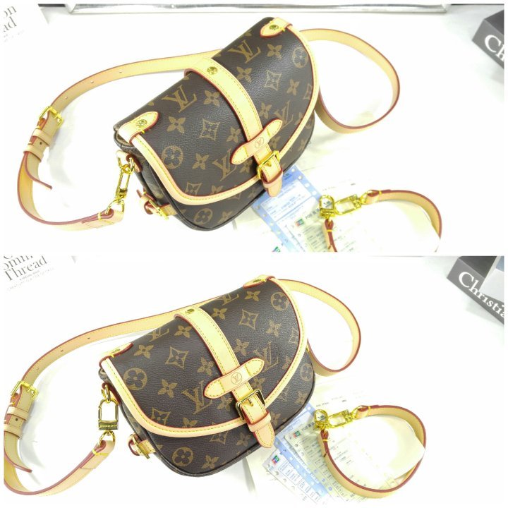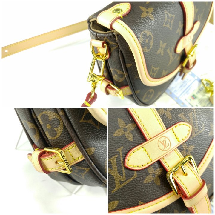 · 모노그램 코팅 캔버스 · 천연 카우하이드 트리밍 · 마이크로화이버 안감 · 골드 색상 하드웨어 · 자석형 잠금장치가 있는 천연 카우하이드 가죽 소재의 버클 · 옆면 버클 2개 · 뒷면 플랫 포켓 · 스트랩:탈부착 가능, 길이 조절 가능