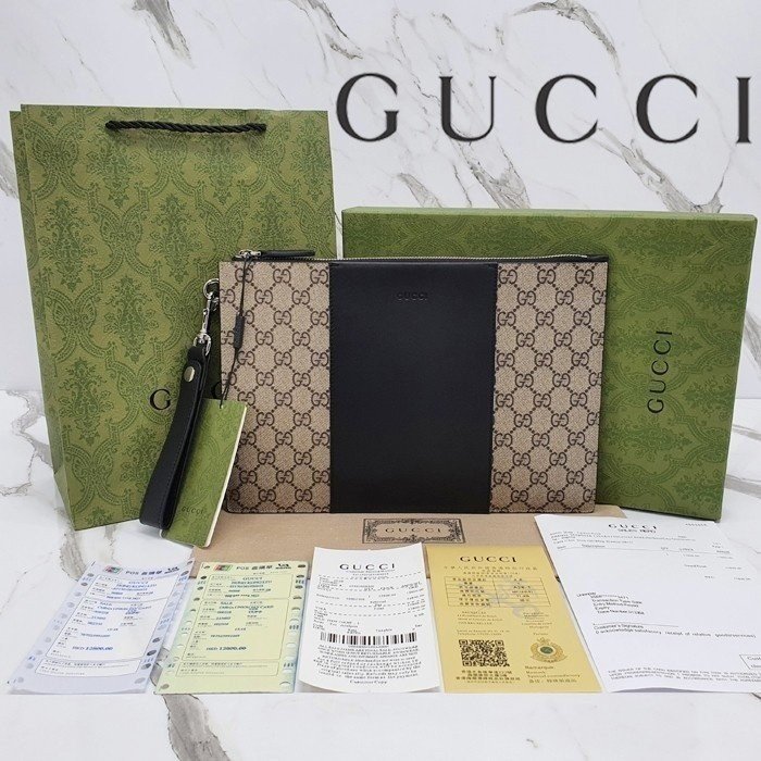 🔘색상 : 베이지&블랙 🔘사이즈 : W30.5cm x H21cm 🔘기타정보 : -제품 NO. 495017 -남/여공용 클러치백 -소재 GG 수프림 캔버스 & 최고급 소가죽 -스트랩 탈/부착 가능 -본품+더스트+박스+책자+영수증+쇼핑백 풀구성