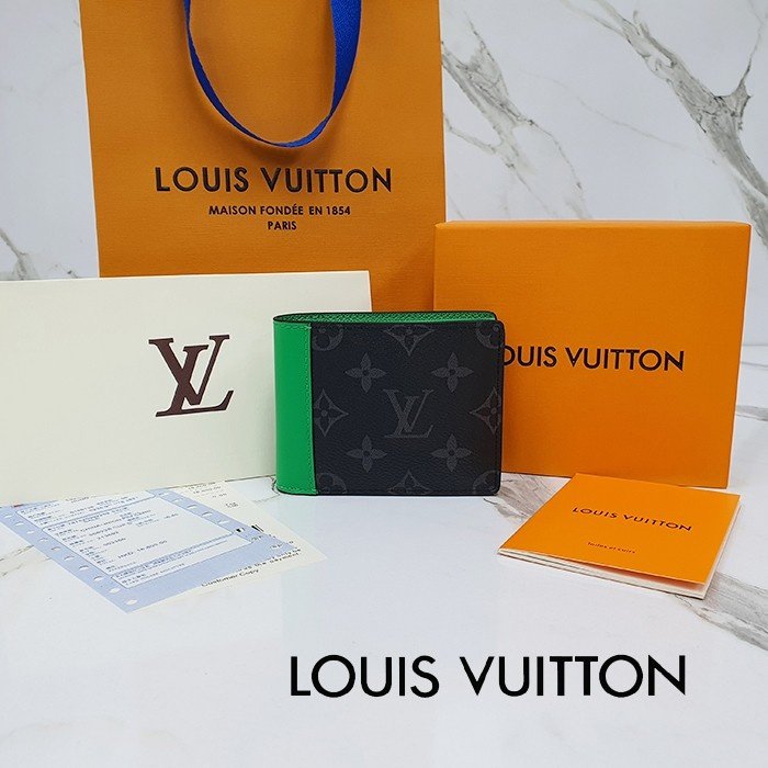 🔘색상 : 블랙&그린 🔘사이즈 : W11cm x H8.5cm 🔘기타정보 : -제품 NO. M25849 -남성용 반지갑 -소재 모노그램 캔버스/최고급 소가죽 -포켓 지폐1/카드8/보조2 -본품+더스트+박스+책자+영수증+쇼핑백 풀구성