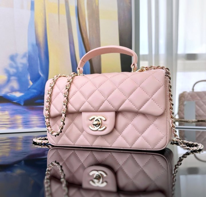 [국내배송]샤넬 뉴미니 탑핸들백 램스킨 핑크 금장 AS2431