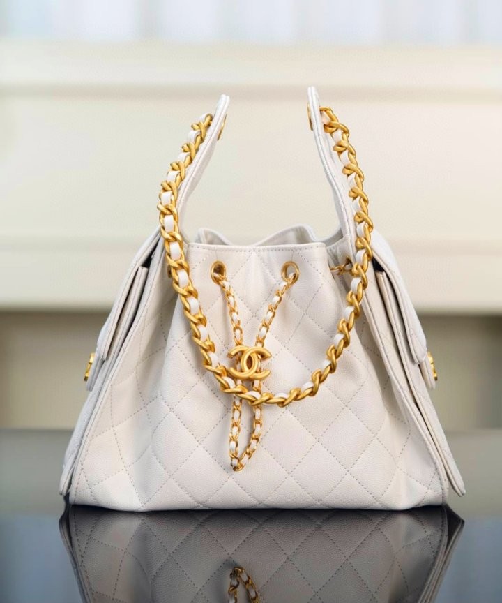 ✔ 은은한 광택의 화이트 HAAS 캐비어 가죽 + 빈티지 골드 체인