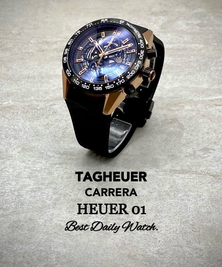카레이싱에서 영감을 얻은 클래식 하면서도 현대적인 스포츠시계인 까레라 칼리버 호이어 01 크로노 그래프입니다 블랙베젤과 태그호이어 특유의 블랙펀칭 러버스트랩의 조화가 고급스러움을 더합니다 데일리 워치로 강추합니다 고급 케이스 포함