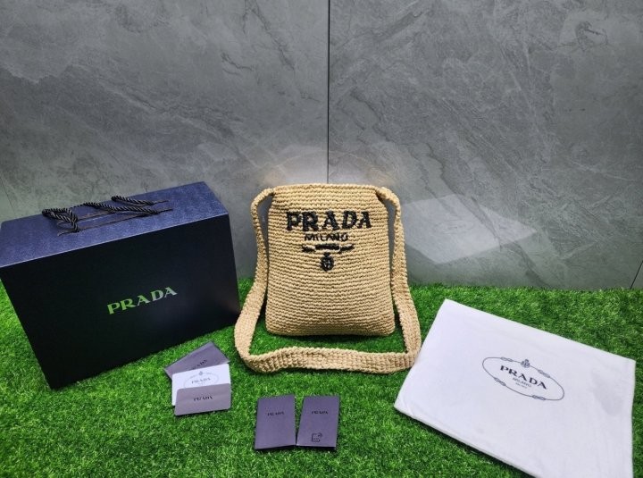 프라다 라피아 라탄 숄더백 입고 되었습니다 라탄소재부터 삼각로고,가죽, 쉐입,포장까지 정품급 입니다 남녀공용이며 선물용으로 너무 좋은제품 입니다. 사진동일 케이스, 더스트, 쇼핑백, 풀구성 출고 입니다.